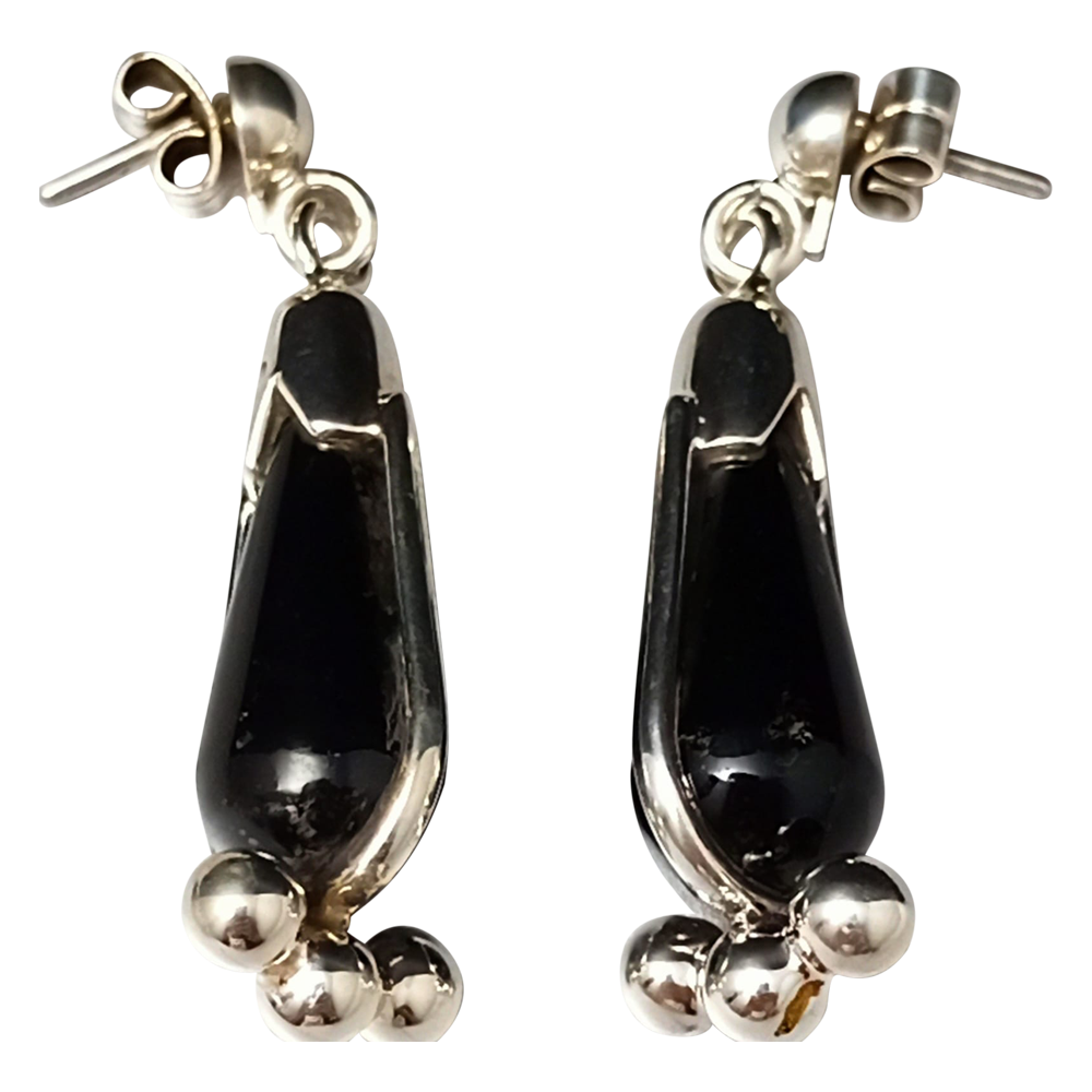 Highlighted by their sleek silver frames and luminous onyx accents, these dangling earrings exude modern sophistication. Created by skilled artisans in Taxco’s renowned Spratling Silver workshop, they offer both elegance and versatility.