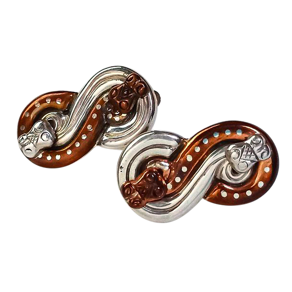 Channeling the mystery and allure of ancient motifs, these snake-shaped silver earrings are a standout piece of artistry. Handcrafted in Taxco with the finest attention to detail, they embody William Spratling’s passion for unique and symbolic designs.