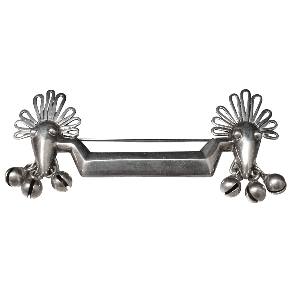 Exquisitamente detallado, este broche de plata presenta intrincadas figuras complementadas con elegantes esferas colgantes a cada lado, creando un diseño dinámico y elegante. Elaborado artesanalmente en Taxco, Guerrero, refleja el legado de Spratling Silver de meticulosa artesanía y arte.